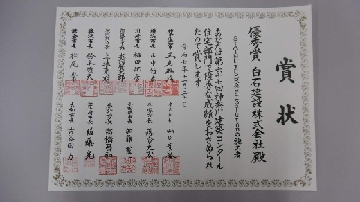 神奈川県の建築文化・建築技術の向上を図り、魅力あるまちづくりを推進するため、 県及び12市が主催し、優れた建築物の建築主・設計者・施工者を表彰するコンクールで Saluton(サルートン) 「工事名:吉澤ビル新築工事」が優秀賞を受賞致しました。