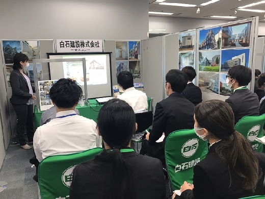 コロナ禍の中、対策を講じながら19社の建設業界企業が出展し、多くの学生が参加しました。